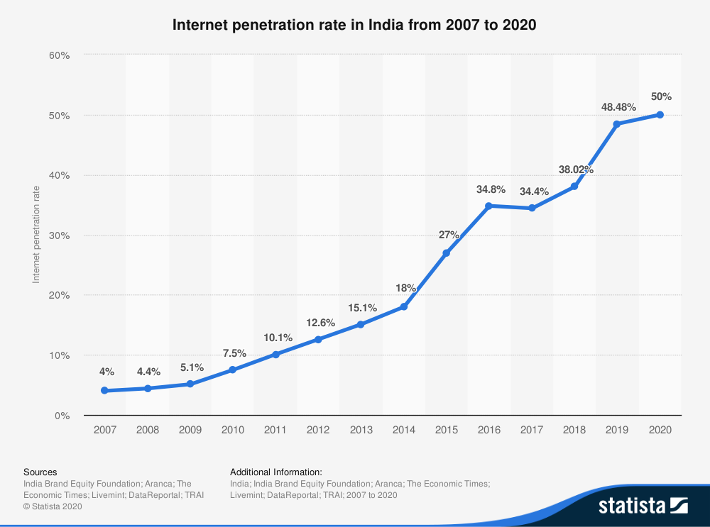 While in India, we see a 50% penetration… 20 years after the US hit that same number. While in absolute values, India internet usage is huge, around 690 million (50% of 1.38 billion total population), getting that next 690 million people online means lots of opportunity. More than double the opportunity in the US at full market penetration. Also, compare the shapes of the two graphs.