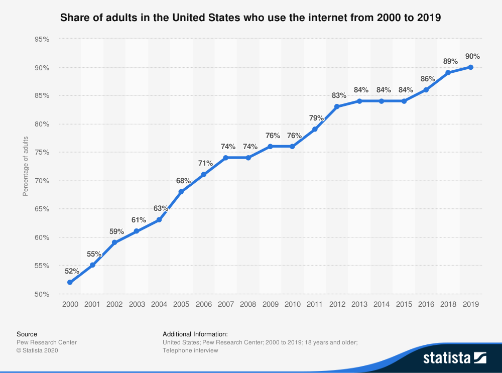 In fact, if we look at the USA, we can see there’s a 90% internet penetration rate with adults in 2019 which means that we have roughly 295.5 million people (90% of 328.2 million) using the internet. (Here’s the 2017 overall internet penetration as well, at just under 90%, to show that the adult population is representative.)